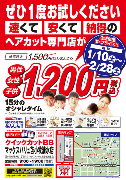 1/10キャンペーンスタート!クイックカットBBマックスバリュ苫小牧清水店 キャンペーン情報2026.01.09 生活応援ザ・プライス! 通常1,500円のところ期間限定で1,200円の特別価格! この際にぜひ一度お試しください。 皆様のご来店心よりお待ちしております。 クイックカットBB マックスバリュ苫小牧清水店
